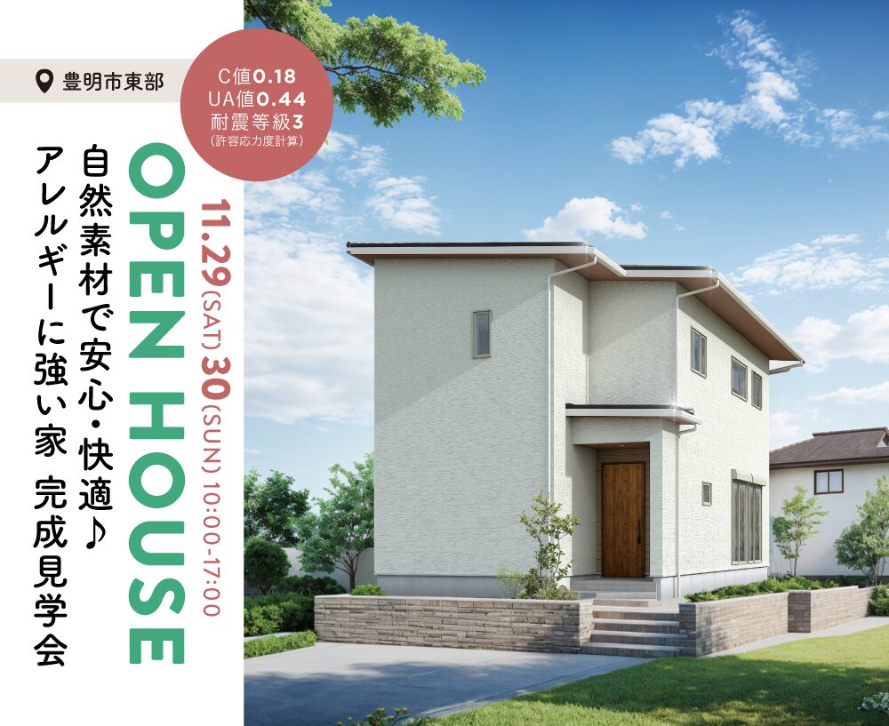 豊明市東部で、自然素材で安心・快適♪ アレルギーに強い家の完成見学会を開催します。