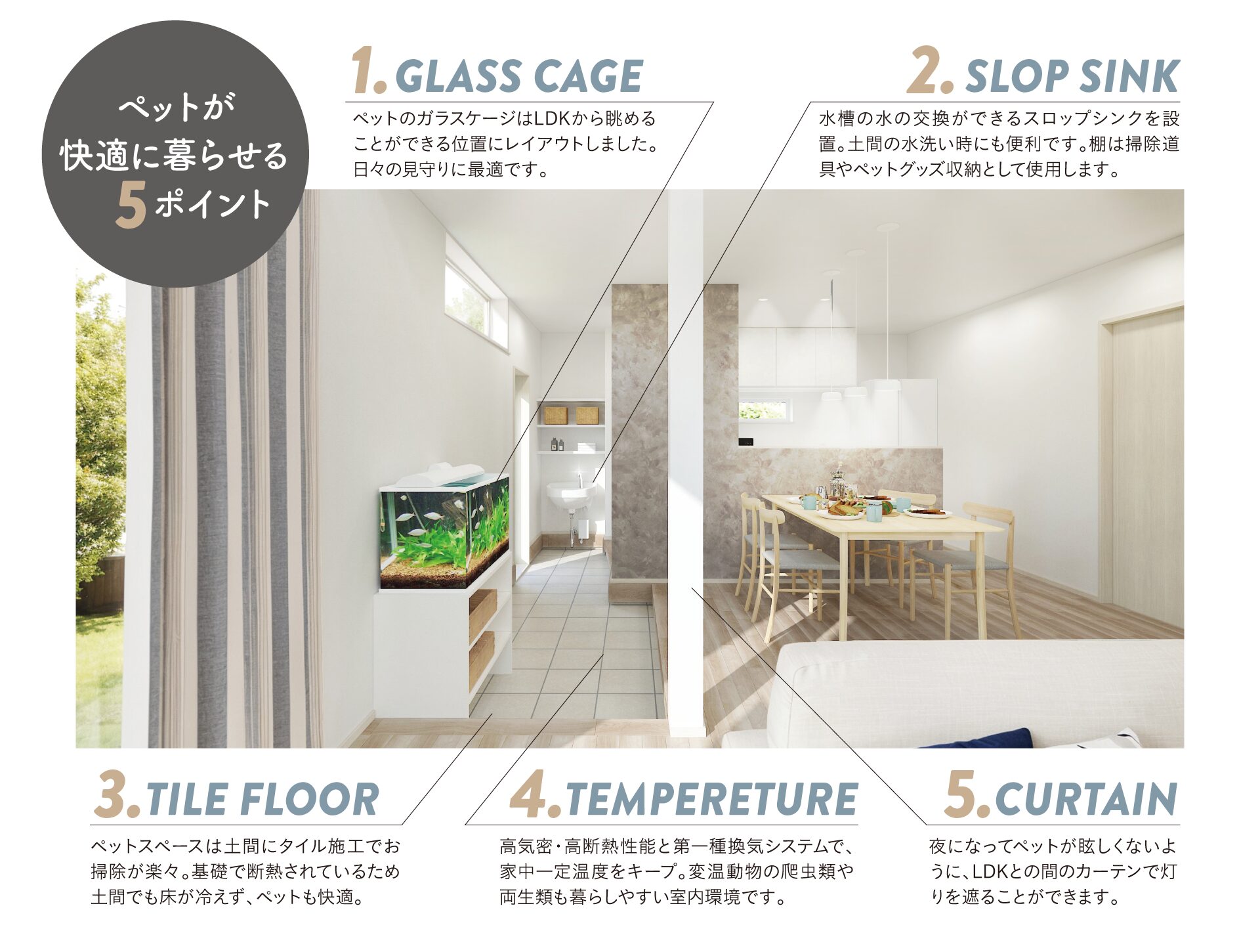 1.ペットのガラスケージはLDKから眺めることができる位置にレイアウトしました。日々の見守りに最適です。