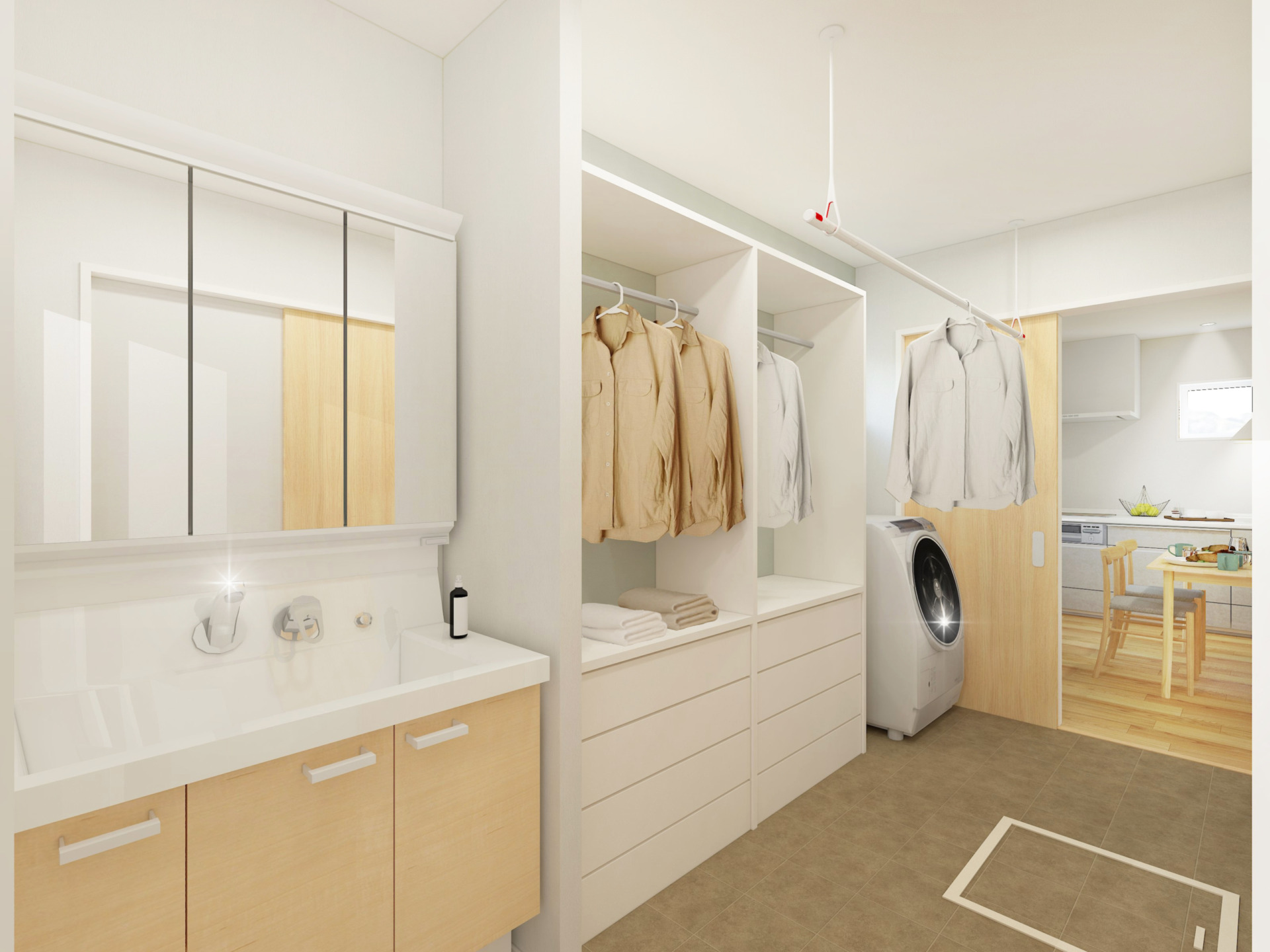 ランドリーとクローゼットが1つの空間に集約されているため、洗濯物を洗う・干す・しまうまでがその場で完結します。