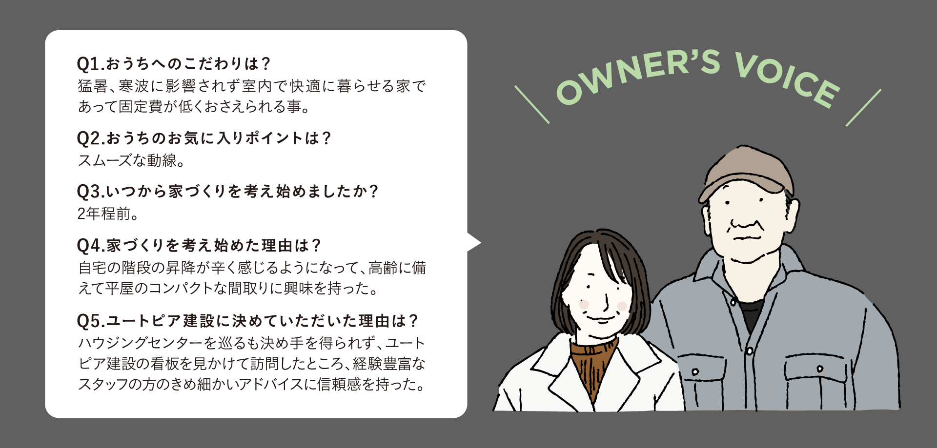 シニアご夫婦の「生涯安心して暮らしたい」という願いを叶える平屋です。
