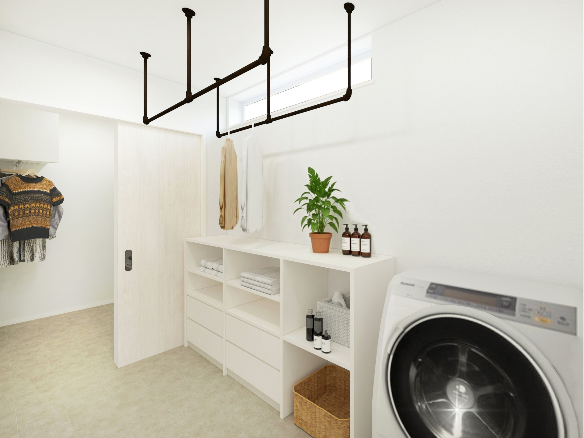洗濯・室内干し・アイロンまでが最短距離で完結、さらにランドリー奥にはファミリークローゼットを併設し、乾いた洗濯物をすぐにしまうことができます。